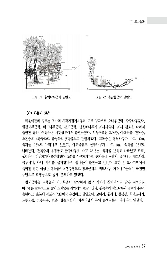 Ⅱ. 조사결과 www.nie.re.kr ? 87 그림 71. 황벽나무군락 단면도 그림 72. 돌단풍군락 단면도 아 비운이 코스 비운이골의 경로는 조사의 시작지점에서부터 도로 양쪽으로 소나무군락, 층충나무군락, 굴참나무군락, 버드나무군락, 창포군락, 산돌배나무가 조사되었다. 조사 경로를 따라서 출현한 굴참나무군락은 사면상부에서 출현하였다. 식생구조는 교목층, 아교목층, 관목층, 초본층의 4층구조로 중경목의 3령급으로 관찰되었다. 교목층은 굴참나무가 수고 10m, 식피율 95%로 나타나고 있었고, 아교목층도 굴참나무가 수고 6m, 식피율 15%로 나타났다. 관목층의 우점종도 굴참나무로 수고 약 3m, 식피율 15%로 나타났고 싸리, 생강나무, 더위지기가 출현하였다. 초본층은 큰까치수염, 큰기름새, 산딸기, 국수...