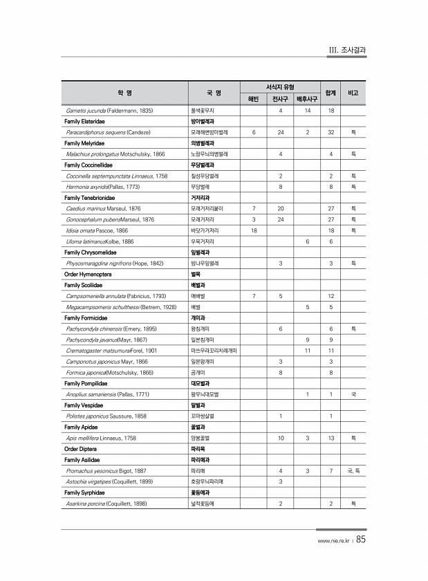III. 조사결과 www.nie.re.kr ? 85 학 명 국 명 서식지 유형 합계 비고 해빈 전사구 배후사구 Gametis jucunda Faldermann, 1835 풀색꽃무지 4 14 18 Family Elateridae 방아벌레과 Paracardiphorus sequens Candeze 모래해변방아벌레 6 24 2 32 특 Family Melyridae 의병벌레과 Malachius prolongatus Motschulsky, 1866 노랑무늬의병벌레 4 4 특 Family Coccinellidae 무당벌레과 Coccinella septempunctata Linnaeus, 1758 칠성무당벌레 2 2 특 Harmonia axyridis Pallas, 1773 무당벌레 8 8 특 Family Tenebr...