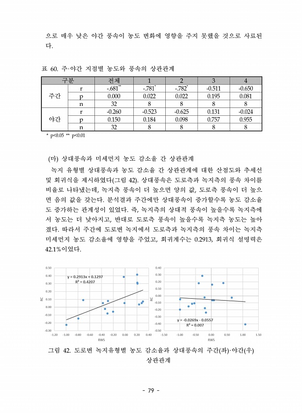 79 으로 매우 낮은 야간 풍속이 농도 변화에 영향을 주지 못했을 것으로 사료된 다. 구분 전체 1 2 3 4 주간 r -.681** -.N81* -.N82* -0.B11 -0.6B0 p 0.000 0.022 0.022 0.18B 0.081 n 32 8 8 8 8 야간 r -0.260 -0.B23 -0.62B 0.131 -0.024 p 0.1B0 0.184 0.088 0.NBN 0.8BB n 32 8 8 8 8 * p.0.0B ** p.0.01 표 60. 주·야간 지점별 농도와 풍속의 상관관계 마 상대풍속과 미세먼지 농도 감소율 간 상관관계 녹지 유형별 상대풍속과 농도 감소율 간 상관관계에 대한 산점도와 추세선 및 회귀식을 제시하였다 그림 42 상대풍속은 도로측과 녹지측의 풍속 차이를 비율로 나타냈는데, 녹...