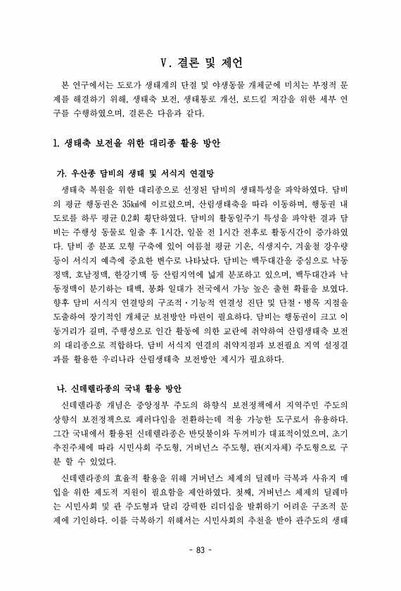 83 Ⅴ. 결론 및 제언 본 연구에서는 도로가 생태계의 단절 및 야생동물 개체군에 미치는 부정적 문 제를 해결하기 위해, 생태축 보전, 생태통로 개선, 로드킬 저감을 위한 세부 연 구를 수행하였으며, 결론은 다음과 같다. 1. 생태축 보전을 위한 대리종 활용 방안 가. 우산종 담비의 생태 및 서식지 연결망 생태축 복원을 위한 대리종으로 선정된 담비의 생태특성을 파악하였다. 담비 의 평균 행동권은 35㎢에 이르렀으며, 산림생태축을 따라 이동하며, 행동권 내 도로를 하루 평균 0.2회 횡단하였다. 담비의 활동일주기 특성을 파악한 결과 담 비는 주행성 동물로 일출 후 1시간, 일몰 전 1시간 전후로 활동시간이 증가하였 다. 담비 종 분포 모형 구축에 있어 여름철 평균 기온, 식생지수, 겨울철 강우량 등이 서식지 ...