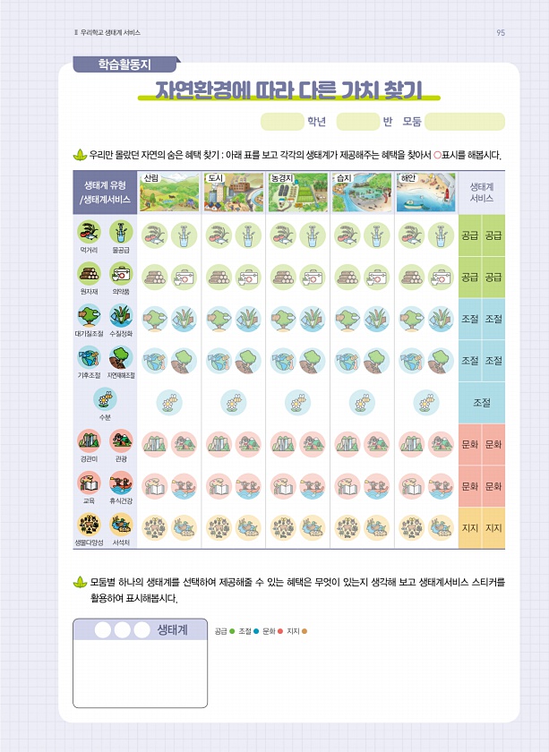 학습활동지 자연환경에 따라 다른 가치 찾기 학년 반 모둠 우리만 몰랐던 자연의 숨은 혜택 찾기 아래 표를 보고 각각의 생태계가 제공해주는 혜택을 찾아서 ○표시를 해봅시다. 생태계 유형 /생태계서비스 생태계 서비스 공급 공급 먹거리 물공급 공급 공급 원자재 의약품 조절 조절 대기질조절 수질정화 조절 조절 기후조절 자연재해조절 조절 수분 문화 문화 경관미 관광 문화 문화 교육 휴식건강 지지 지지 생물다양성 서석처 모둠별 하나의 생태계를 선택하여 제공해줄 수 있는 혜택은 무엇이 있는지 생각해 보고 생태계서비스 스티커를 활용하여 표시해봅시다. ●●● 생태계 공급 ● 조절 ● 문화 ● 지지 ● 산림 도시 농경지 습지 해안 Ⅱ 우리학교 생태계 서비스95