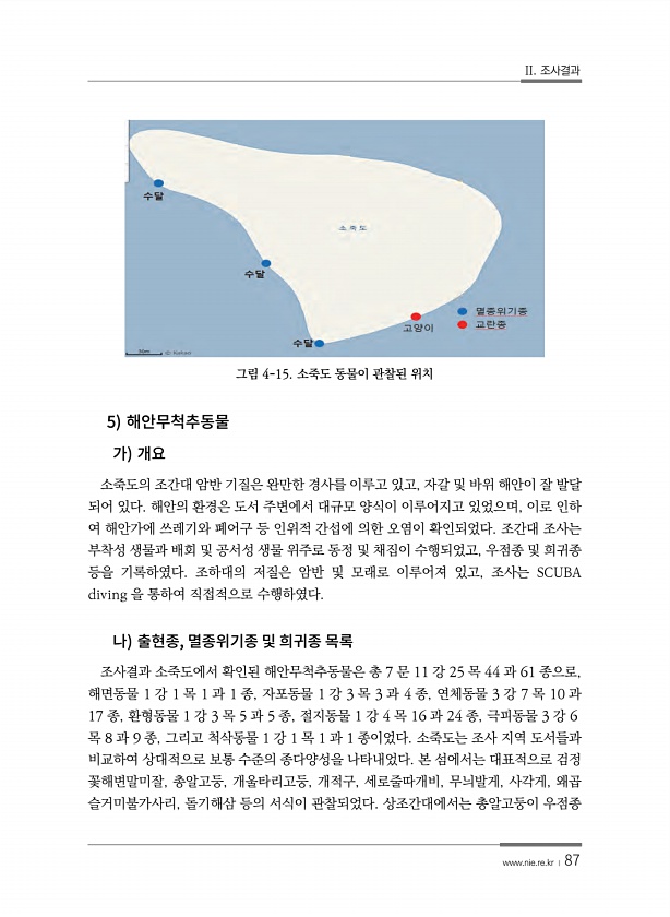 II. 조사결과 www.nie.re.kr ? 87 그림 4-15. 소죽도 동물이 관찰된 위치 5 소죽도의 조간대 암반 기질은 완만한 경사를 이루고 있고, 자갈 및 바위 해안이 잘 발달 되어 있다. 해안의 환경은 도서 주변에서 대규모 양식이 이루어지고 있었으며, 이로 인하 여 해안가에 쓰레기와 폐어구 등 인위적 간섭에 의한 오염이 확인되었다. 조간대 조사는 부착성 생물과 배회 및 공서성 생물 위주로 동정 및 채집이 수행되었고, 우점종 및 희귀종 등을 기록하였다. 조하대의 저질은 암반 및 모래로 이루어져 있고, 조사는 SCUBA diving 을 통하여 직접적으로 수행하였다. , 조사결과 소죽도에서 확인된 해안무척추동물은 총 7 문 11 강 25 목 44 과 61 종으로, 해면동물 1 강 1 목 1 과 1 종, ...