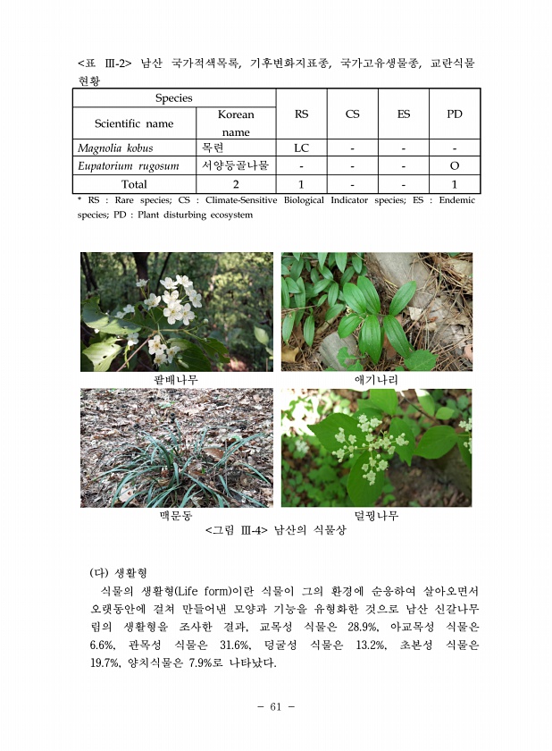 61 표 Ⅲ-2 남산 국가적색목록, 기후변화지표종, 국가고유생물종, 교란식물 현황 Species RS CS ES PD Scientific name Korean name Magnolia kobus 목련 LC Eupatorium rugosum 서양등골나물 O Total 2 1 1 * RS Rare species; CS Climate-Sensitive Biological Indicator species; ES Endemic species; PD Plant disturbing ecosystem 팥배나무 애기나리 맥문동 덜꿩나무 그림 Ⅲ-4 남산의 식물상 다 생활형 식물의 생활형 Life form 이란 식물이 그의 환경에 순응하여 살아오면서 오랫동안에 걸쳐 만들어낸 모양과 기능을 유형화한 것으로 남산 신갈나무 림의 ...