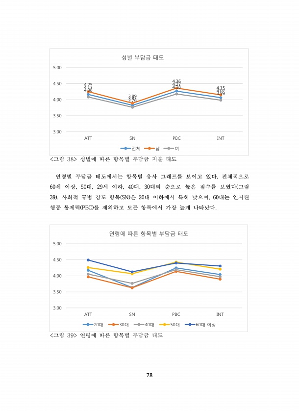 78 그림 38 성별에 따른 항목별 부담금 지불 태도 연령별 부담금 태도에서는 항목별 유사 그래프를 보이고 있다. 전체적으로 60세 이상, 50대, 29세 이하, 40대, 30대의 순으로 높은 점수를 보였다 그림 39 사회적 규범 강도 항목 SN 은 20대 이하에서 특히 낮으며, 60대는 인지된 행동 통제력 PBC 를 제외하고 모든 항목에서 가장 높게 나타났다. 그림 39 연령에 따른 항목별 부담금 태도 4.17 3.83 4.27 4.07 4.25 3.89 4.36 4.15 4.08 3.76 4.18 3.99 3.00 3.50 4.00 4.50 5.00 ATT SN PBC INT 성별 부담금 태도 전체 남 여 3.00 3.50 4.00 4.50 5.00 ATT SN PBC INT 연령에 따른 항목별 부담금 ...