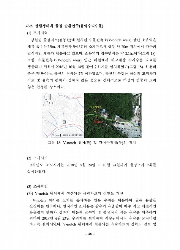 48 다-2. 산림생태계 물질 순환연구 유역수리수문 1 조사지역 강원권 중점지소 점봉산 에 설치된 수문관측소 V-notch weir 상단 소유역은 계류 폭 1.22.5m, 계류경사 515%의 소계류로서 상부 약 70m 위치에서 다수의 일시적인 계류가 합류하고 있으며, 소유역의 집수면적은 약 2.1ha이다 그림 18 또한, 수문관측소 V-notch weir 인근 하천에서 비교대상 수리수문 자료를 생산하기 위하여 2016년 10월 14일 간이수위계를 설치하였다 그림 18 하천의 폭은 약 914m, 하천의 경사는 2% 이하였으며, 하천의 특징은 하상의 고저차가 작고 및 유속의 편차가 심하지 않은 곳으로 전체적으로 하상의 변동이 크지 않은 안정된 장소이다. 그림 18. V-notch 위어 좌 및 간이수위계 우 의 ...