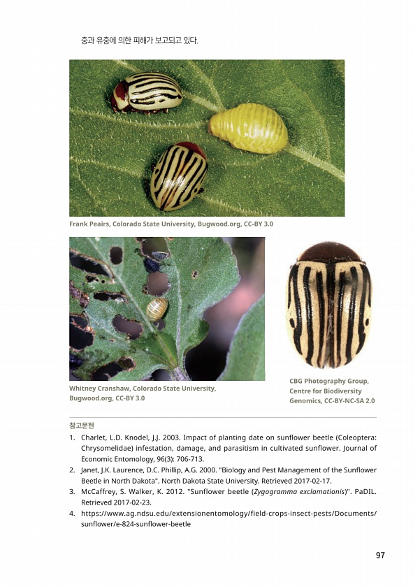 97 충과 유충에 의한 피해가 보고되고 있다. 참고문헌 1. Charlet, L.D. Knodel, J.J. 2003. Impact of planting date on sunflower beetle ColeopteraChrysomelidae infestation, damage, and parasitism in cultivated sunflower. Journal of Economic Entomology, 96 3 706-713. 2. Janet, J.K. Laurence, D.C. Phillip, A.G. 2000. Biology and Pest Management of the Sunflower Beetle in North Dakota. North Dakota State University. Retrieve...