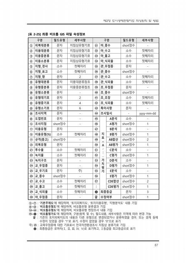 제2장 도시생태현황지도 작성원칙 및 방법 87 구분 필드유형 세부사항 구분 필드유형 세부사항 ① 피복대분류 문자 지침상유형기호 ?31 아_종수 short정수 ② 이용대분류 문자 지침상유형기호 ?32 아_수고 소수 첫째자리 ③ 이용중분류 문자 지침상유형기호 ?33 아_흉고 소수 첫째자리 ④ 이용소분류 문자 지침상유형기호 ?34 아_식피율 소수 첫째자리 ⑤ 지형_경사 소수 첫째자리 ?35 관_우점종 문자 ⑥ 지형_표고 소수 첫째자리 ?36 관_종수 short정수 ⑦ 지형_향 문자 2 ?37 관_수고 소수 첫째자리 ⑧ 유형대분류 문자 이용대분류참조 ?38 관_식피율 소수 첫째자리 ⑨ 유형중분류 문자 이용중분류참조 ?39 초_우점종 문자 ⑩ 유형소분류 문자 ?40 초_종수 short정수 ⑪ 유형대기호 문자 2 ?4...