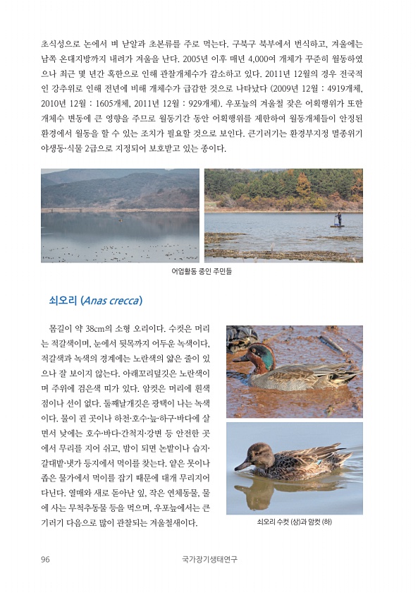 96 국가장기생태연구 어업활동 중인 주민들 초식성으로 논에서 벼 낟알과 초본류를 주로 먹는다. 구북구 북부에서 번식하고, 겨울에는 남쪽 온대지방까지 내려가 겨울을 난다. 2005년 이후 매년 4,000여 개체가 꾸준히 월동하였 으나 최근 몇 년간 혹한으로 인해 관찰개체수가 감소하고 있다. 2011년 12월의 경우 전국적 인 강추위로 인해 전년에 비해 개체수가 급감한 것으로 나타났다 2009년 12월 4919개체, 2010년 12월 1605개체, 2011년 12월 929개체 우포늪의 겨울철 잦은 어획행위가 또한 개체수 변동에 큰 영향을 주므로 월동기간 동안 어획행위를 제한하여 월동개체들이 안정된 환경에서 월동을 할 수 있는 조치가 필요할 것으로 보인다. 큰기러기는 환경부지정 멸종위기 야생동·식물 2급으로 지정...