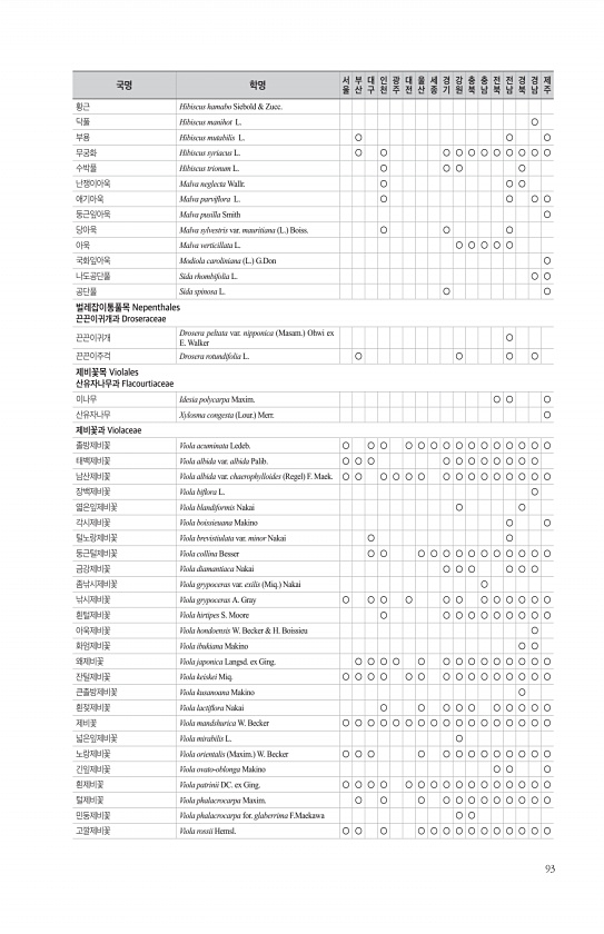 93 황근 Hibiscus hamabo Siebold & Zucc. 닥풀 Hibiscus manihot L. ○ 부용 Hibiscus mutabilis L. ○ ○ ○ 무궁화 Hibiscus syriacus L. ○ ○ ○ ○ ○ ○ ○ ○ ○ ○ ○ 수박풀 Hibiscus trionum L. ○ ○ ○ ○ 난쟁이아욱 Malva neglecta Wallr. ○ ○ ○ 애기아욱 Malva parvifora L. ○ ○ ○ ○ 둥근잎아욱 Malva pusilla Smith ○ 당아욱 Malva sylvestris var. mauritiana L. Boiss. ○ ○ ○ 아욱 Malva verticillata L. ○ ○ ○ ○ ○ 국화잎아욱 Modiola caroliniana L. G.Don ○ 나도공단풀 Si...