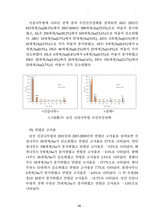 66 신갈나무림에 나타난 전체 종의 수간건강상태를 살펴보면 AS는 2011년 815개체/ha 58.3% 에서 2017-2018년 908개체/ha 72.9% 으로 비율이 증가하 였고, AL은 254개체/ha 18.2% 에서 169개체/ha 13.6% 으로 비율이 감소하였 다. AB는 10개체/ha 0.7% 에서 37개체/ha 3.0% , AD는 2개체/ha 0.1% 에서 43개체/ha 3.5% 으로 각각 비율이 증가하였고, AF는 8개체/ha 0.6% 에서 6 개체/ha 0.5% , DS은 86개체/ha 6.2% 에서 23개체/ha 1.8% 로 비율이 각각 감소하였다. DL은 6개체/ha 0.4% 에서 6개체/ha 0.5% 로 비율이 증가하였고 DB은 25개체/ha 1.8% 에서 20개체/ha 1.6% , D...