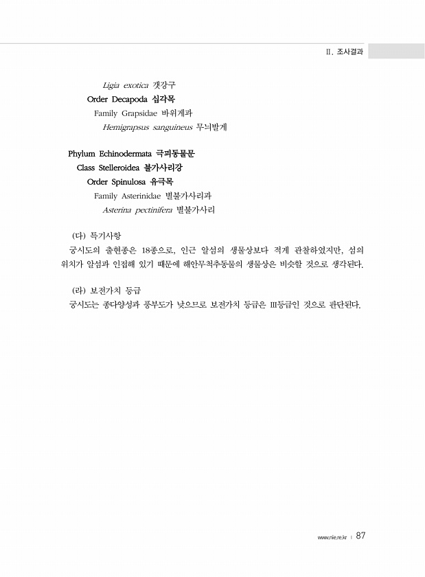 Ⅱ. 조사결과 www.nie.re.kr ? 87 Ligia exotica 갯강구 Order Decapoda 십각목 Family Grapsidae 바위게과 Hemigrapsus sanguineus 무늬발게 Phylum Echinodermata 극피동물문 Class Stelleroidea 불가사리강 Order Spinulosa 유극목 Family Asterinidae 별불가사리과 Asterina pectinifera 별불가사리 다 특기사항 궁시도의 출현종은 18종으로, 인근 알섬의 생물상보다 적게 관찰하였지만, 섬의 위치가 알섬과 인접해 있기 때문에 해안무척추동물의 생물상은 비슷할 것으로 생각된다. 라 보전가치 등급 궁시도는 종다양성과 풍부도가 낮으므로 보전가치 등급은 Ⅲ등급인 것으로판단된다.