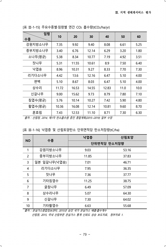 Ⅲ. 지역 생태계서비스 평가 79 임령 수종 10 20 30 40 50 60 강원지방소나무 7.35 9.92 9.40 8.08 6.61 5.25 중부지방소나무 3.40 6.76 12.14 6.29 3.20 1.80 소나무 평균 5.38 8.34 10.77 7.19 4.92 3.51 잣나무 5.31 11.55 10.61 8.9 7.50 6.40 낙엽송 8.96 10.31 9.27 8.33 7.70 7.30 리기다소나무 4.42 13.6 12.16 6.47 5.10 4.00 편백 5.10 8.67 8.03 6.47 5.10 4.00 상수리 11.72 16.53 14.55 12.83 11.0 10.0 신갈나무 9.00 15.62 9.73 8.79 7.80 7.10 침엽수 평균 5.76 10.14 10.27 7.4...