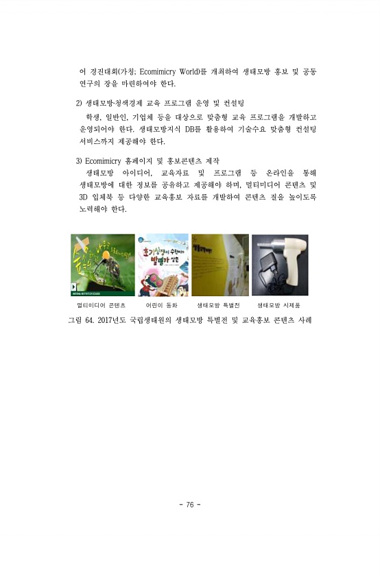 76 어 경진대회 가칭; Ecomimicry World 를 개최하여 생태모방 홍보 및 공동 연구의 장을 마련하여야 한다. 2 생태모방?청색경제 교육 프로그램 운영 및 컨설팅 학생, 일반인, 기업체 등을 대상으로 맞춤형 교육 프로그램을 개발하고 운영되어야 한다. 생태모방지식 DB를 활용하여 기술수요 맞춤형 컨설팅 서비스까지 제공해야 한다. 3 Ecomimicry 홈페이지 및 홍보콘텐츠 제작 생태모방 아이디어, 교육자료 및 프로그램 등 온라인을 통해 생태모방에 대한 정보를 공유하고 제공해야 하며, 멀티미디어 콘텐츠 및 3D 입체북 등 다양한 교육홍보 자료를 개발하여 콘텐츠 질을 높이도록 노력해야 한다. 멀티미디어 콘텐츠 어린이 동화 생태모방 특별전 생태모방 시제품 그림 64. 2017년도 국립생태원의 생태모방 ...