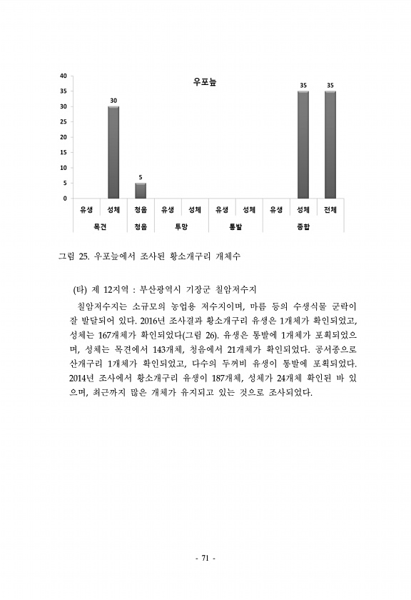 71 그림 25. 우포늪에서 조사된 황소개구리 개체수 타 제 12지역 부산광역시 기장군 칠암저수지 칠암저수지는 소규모의 농업용 저수지이며, 마름 등의 수생식물 군락이 잘 발달되어 있다. 2016년 조사결과 황소개구리 유생은 1개체가 확인되었고, 성체는 167개체가 확인되었다 그림 26 유생은 통발에 1개체가 포획되었으 며, 성체는 목견에서 143개체, 청음에서 21개체가 확인되었다. 공서종으로 산개구리 1개체가 확인되었고, 다수의 두꺼비 유생이 통발에 포획되었다. 2014년 조사에서 황소개구리 유생이 187개체, 성체가 24개체 확인된 바 있 으며, 최근까지 많은 개체가 유지되고 있는 것으로조사되었다.