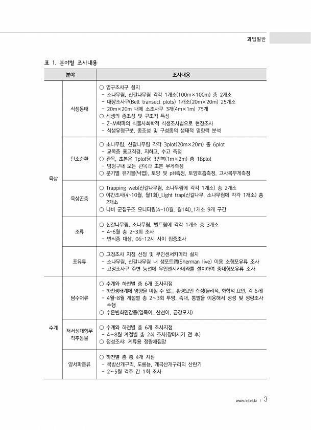 과업일반 www.nie.re.kr ? 3 표 1. 분야별 조사내용 분야 조사내용 육상 식생동태 ○ 영구조사구 설치 소나무림, 신갈나무림 각각 1개소 100m×100m 총 2개소 대상조사구 Belt transect plots 1개소 20m×20m 25개소 20m×20m 내에 소조사구 3개 4m×1m 75개 ○ 식생의 종조성 및 구조적 특성 Z-M학파의 식물사회학적 식생조사법으로 현장조사 식생유형구분, 종조성 및 구성종의 생태적 영향력 분석 탄소순환 ○ 소나무림, 신갈나무림 각각 3plot 20m×20m 총 6plot 교목층 흉고직경, 지하고, 수고 측정 ○ 관목, 초본은 1plot당 3반복 1m×2m 총 18plot 방형구내 모든 관목과 초본 무게측정 ○ 분기별 유기물 낙엽 , 토양 및 pH측정, 토양호흡측정...