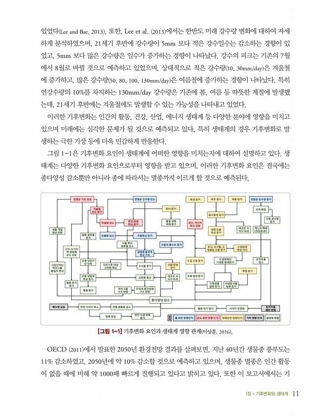 1장 기후변화와 생태계 11 있었다 Lee and Bae, 2013 또한, Lee et al. 2013 에서는 한반도 미래 강수량 변화에 대하여 자세 하게 분석하였으며, 21세기 후반에 강수량이 5mm 보다 적은 강수일수는 감소하는 경향이 있 었고, 5mm 보다 많은 강수량은 일수가 증가하는 경향이 나타났다. 강수의 피크는 기존의 7월 에서 8월로 바뀔 것으로 예측하고 있었으며, 상대적으로 적은 강수량 10, 30mm/day 은 겨울철 에 증가하고, 많은 강수량 50, 80, 100, 130mm/day 은 여름철에 증가하는 경향이 나타났다. 특히 연강수량의 10%를 차지하는 130mm/day 강수량은 기존에 봄, 여름 등 따뜻한 계절에 발생했 는데, 21세기 후반에는 겨울철에도 발생할 수 있는 가능성을 나타...