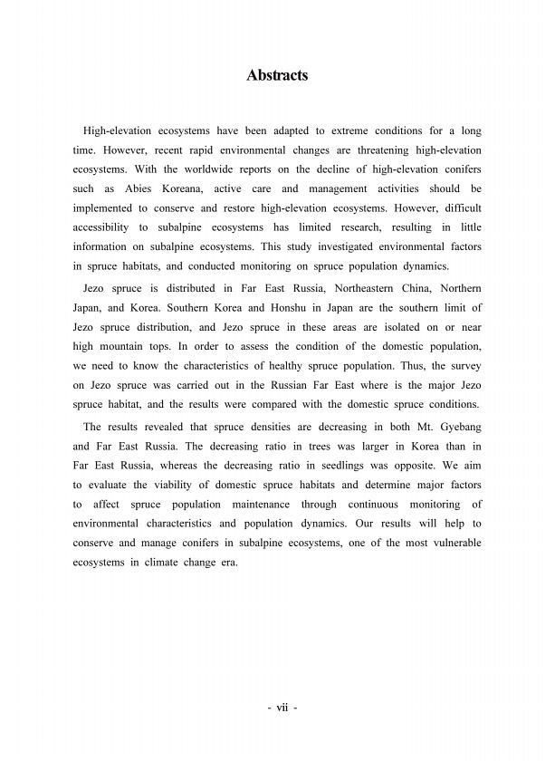 vii Abstracts High-elevation ecosystems have been adapted to extreme conditions for a long time. However, recent rapid environmental changes are threatening high-elevation ecosystems. With the worldwide reports on the decline of high-elevation conifers such as Abies Koreana, active care and management activities should be implemented to conserve and restore high-elevation ecosystems. However, diff...