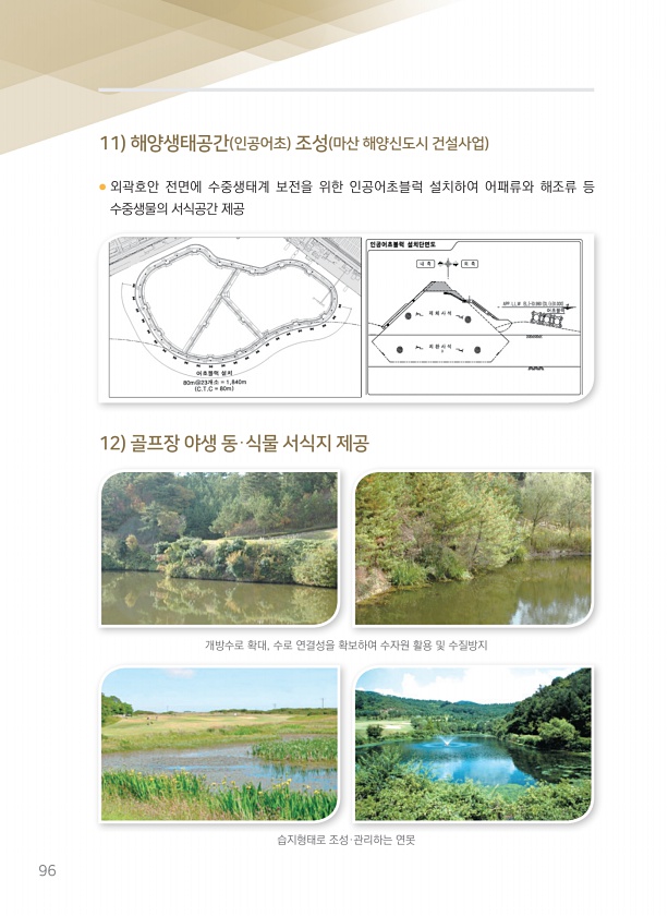 96 11 해양생태공간 인공어초 조성 마산 해양신도시 건설사업 12 골프장 야생 동·식물 서식지 제공 ● 외곽호안 전면에 수중생태계 보전을 위한 인공어초블럭 설치하여 어패류와 해조류 등 수중생물의 서식공간 제공 개방수로 확대, 수로 연결성을 확보하여 수자원 활용 및 수질방지 습지형태로 조성·관리하는연못