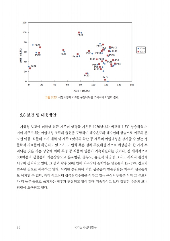 96 국가장기생태연구 그림 3.23 식생조성에 기초한 구상나무림 조사구의 서열화 결과. 5.8 보전 및 대응방안 기상청 보고에 의하면 최근 제주의 연평균 기온은 1930년대와 비교해 1.5℃ 상승하였다. 이미 제주도에는 아열대성 조류의 출현을 포함하여 해수온도와 해수면의 상승으로 어류의 분 포권 이동, 식물의 조기 개화 및 제주조릿대의 확산 등 제주의 아열대성을 감지할 수 있는 생 물학적 지표들이 확인되고 있으며, 그 변화 폭은 점차 뚜렷해질 것으로 예상된다. 한 가지 우 려되는 것은 기온 상승에 의해 특정 동·식물의 멸종이 가속화된다는 것이다. 전 세계적으로 500여종의 생물종이 기온상승으로 분포범위, 풍부도, 유전적 다양성 그리고 서식지 환경에 이상이 생겨나고 있다. 그 결과 향후 50년 안에 지구상에 ...