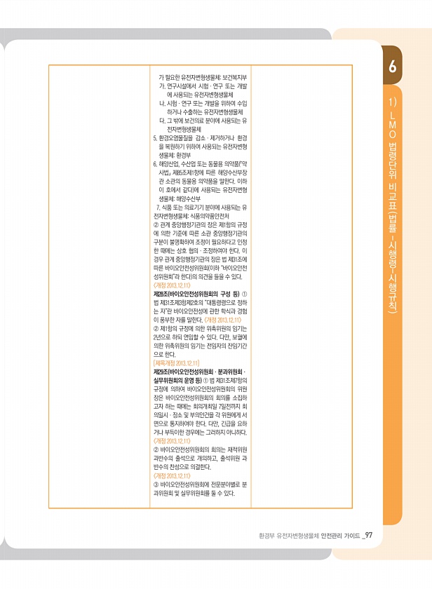 6 환경부 유전자변형생물체 안전관리 가이드 _97 1 L M O 법령단위 비교표 법률- 시행령- 시행규칙 가 필요한 유전자변형생물체보건복지부 가. 연구시설에서 시험ㆍ연구 또는 개발 에 사용되는 유전자변형생물체 나. 시험ㆍ연구 또는 개발을 위하여 수입 하거나 수출하는 유전자변형생물체 다. 그 밖에 보건의료 분야에 사용되는 유 전자변형생물체 5. 환경오염물질을 감소ㆍ제거하거나 환경 을 복원하기 위하여 사용되는 유전자변형 생물체환경부 6. 해양산업, 수산업 또는 동물용 의약품 「약 사법」 제85조제1항에 따른 해양수산부장 관 소관의 동물용 의약품을 말한다. 이하 이 호에서 같다 에 사용되는 유전자변형 생물체해양수산부 7. 식품 또는 의료기기 분야에 사용되는 유 전자변형생물체식품의약품안전처 ② 관계 중앙행정기관의 ...
