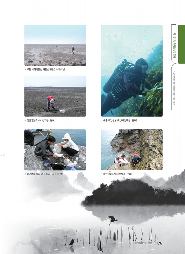 ? 부안 계화리갯벌 해안선개괄조사 1997년 ? 갯벌생물조사 사진제공 은예 ? 수중 해안생물 채집 사진제공 은예 ? 해안생물 채집 및 정리 사진제공 은예 ? 해안생물조사 사진제공 은예 제1장. 전국자연환경조사 NATIONAL INSTITUTE OF ECOLOGY 자연환경조사 30년097