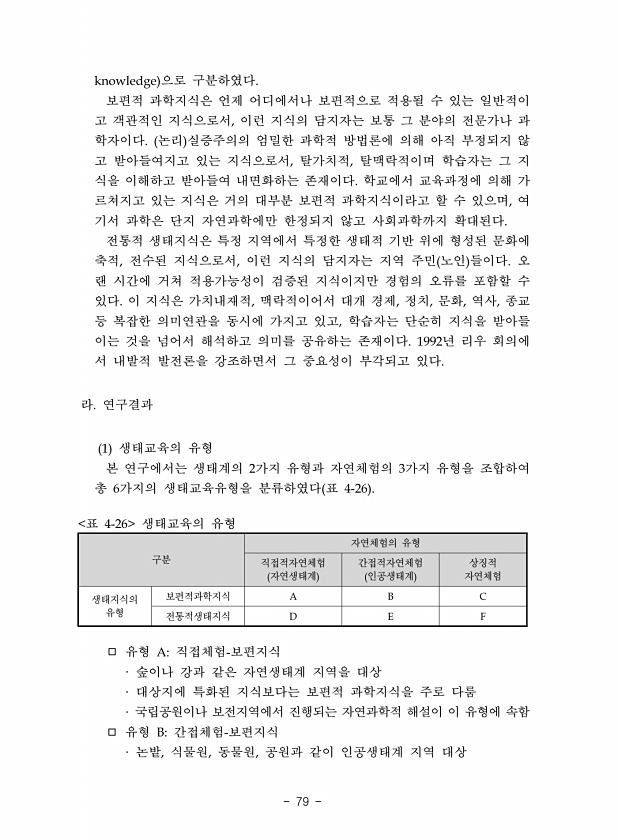 79 으로 구분하였다 보편적 과학지식은 언제 어디에서나 보편적으로 적용될 수 있는 일반적이 고 객관적인 지식으로서 이런 지식의 담지자는 보통 그 분야의 전문가나 과 학자이다 논리 실증주의의 엄밀한 과학적 방법론에 의해 아직 부정되지 않 고 받아들여지고 있는 지식으로서 탈가치적 탈맥락적이며 학습자는 그 지 식을 이해하고 받아들여 내면화하는 존재이다 학교에서 교육과정에 의해 가 르쳐지고 있는 지식은 거의 대부분 보편적 과학지식이라고 할 수 있으며 여 기서 과학은 단지 자연과학에만 한정되지 않고 사회과학까지 확대된다 전통적 생태지식은 특정 지역에서 특정한 생태적 기반 위에 형성된 문화에 축적 전수된 지식으로서 이런 지식의 담지자는 지역 주민 노인 들이다 오 랜 시간에 거쳐 적용가능성이 검증된 지식이지만 경험의 오...