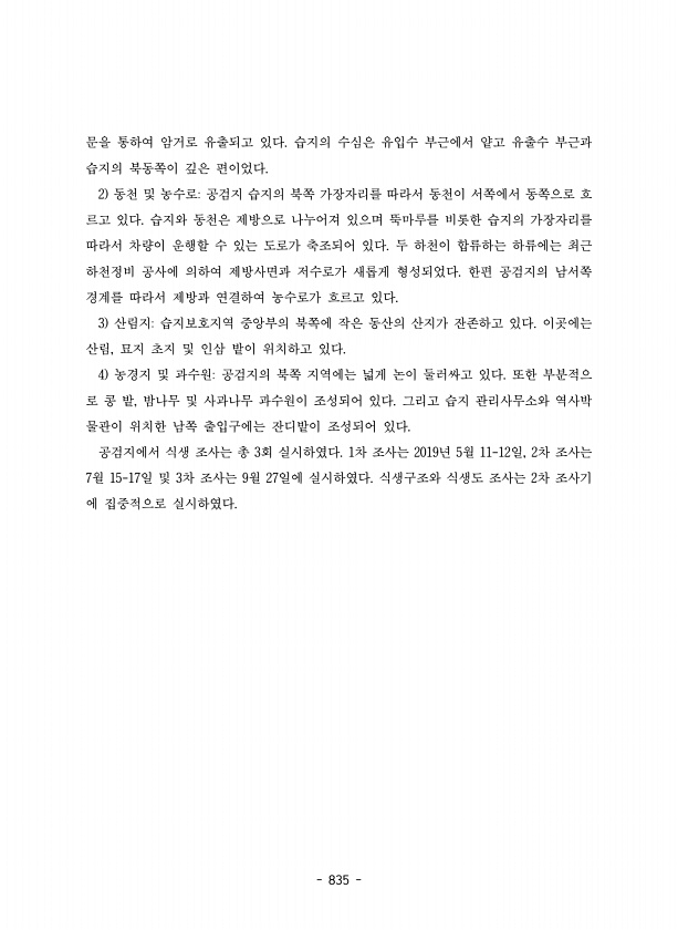 835 문을 통하여 암거로 유출되고 있다. 습지의 수심은 유입수 부근에서 얕고 유출수 부근과 습지의 북동쪽이 깊은 편이었다. 2 동천 및 농수로공검지 습지의 북쪽 가장자리를 따라서 동천이 서쪽에서 동쪽으로 흐 르고 있다. 습지와 동천은 제방으로 나누어져 있으며 뚝마루를 비롯한 습지의 가장자리를 따라서 차량이 운행할 수 있는 도로가 축조되어 있다. 두 하천이 합류하는 하류에는 최근 하천정비 공사에 의하여 제방사면과 저수로가 새롭게 형성되었다. 한편 공검지의 남서쪽 경계를 따라서 제방과 연결하여 농수로가 흐르고 있다. 3 산림지습지보호지역 중앙부의 북쪽에 작은 동산의 산지가 잔존하고 있다. 이곳에는 산림, 묘지 초지 및 인삼 밭이 위치하고 있다. 4 농경지 및 과수원공검지의 북쪽 지역에는 넓게 논이 둘러싸고 있...