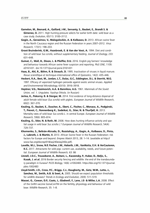 참고문헌 83 Gamelon, M., Besnard, A., Gaillard, J-M., Servanty, S., Baubet, E., Brandt S. & Gimenez, O. 2011. High hunting pressure selects for earlier birth datewild boar as a case study. Evolution, 65 11 3100?3112. Gogin, A., Gerasimov, V., Malogolovkin, A. & Kolbasov, D. 2013. African swine fever in the North Caucasus region and the Russian Federation in years 2007?2012. Virus Research, 173 1 198?2...