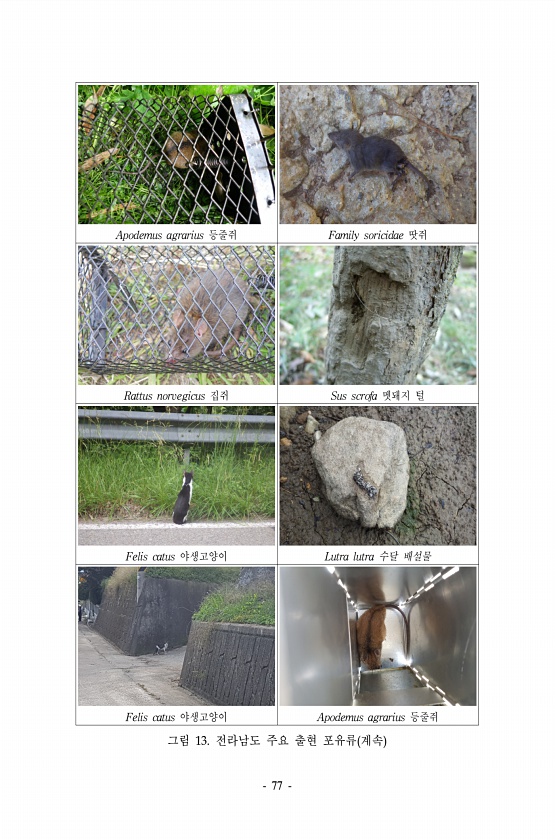 77 Apodemus agrarius 등줄쥐 Family soricidae 땃쥐 Rattus norvegicus 집쥐 Sus scrofa 멧돼지 털 Felis catus 야생고양이 Lutra lutra 수달 배설물 Felis catus 야생고양이 Apodemus agrarius 등줄쥐 그림 13. 전라남도 주요 출현 포유류 계속