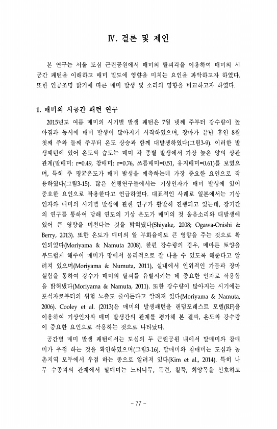 Ⅳ. 결론 및 제언 본 연구는 서울 도심 근린공원에서 매미의 탈피각을 이용하여 매미의 시 공간 패턴을 이해하고 매미 밀도에 영향을 미치는 요인을 파악하고자 하였다. 또한 인공조명 밝기에 따른 매미 발생 및 소리의 영향을 비교하고자 하였다. 1. 매미의 시공간 패턴 연구 2015년도 여름 매미의 시기별 발생 패턴은 7월 넷째 주부터 강수량이 높 아짐과 동시에 매미 발생이 많아지기 시작하였으며, 장마가 끝난 후인 8월 첫째 주와 둘째 주부터 온도 상승과 함께 대발생하였다 그림3-9 이러한 발 생패턴에 있어 온도와 습도는 매미 각 종별 발생에서 가장 높은 양의 상관 관계 말매미r=0.49, 참매미r=0.76, 쓰름매미=0.51, 유지매미=0.61 를 보였으 며, 특히 주 평균온도가 매미 발생을 예측하는데 가장 중...
