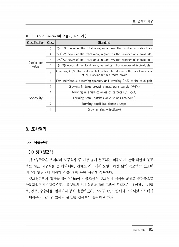Ⅱ. 관매도 사구 www.nie.re.kr ? 85 표 15. Braun-Blanquet의 우점도, 피도 계급 Classification Class Standard Dominance value 5 75~100 cover of the total area, regardless the number of individuals 4 50~75 cover of the total area, regardless the number of individuals 3 25~50 cover of the total area, regardless the number of individuals 2 5~25 cover of the total area, regardless the number of individuals 1 Covering 5...