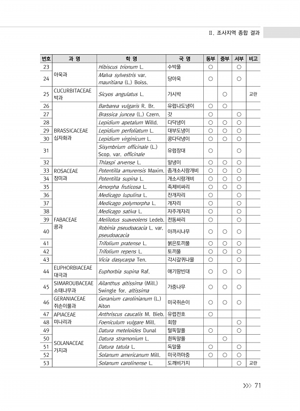 Ⅱ. 조사지역 종합 결과 71 번호 과 명 학 명 국 명 동부 중부 서부 비고 23 아욱과 Hibiscus trionum L. 수박풀 ○ ○ 24 Malva sylvestris var. mauritiana L. Boiss. 당아욱 ○ ○ 25 CUCURBITACEAE 박과 Sicyos angulatus L. 가시박 ○ 교란 26 BRASSICACEAE 십자화과 Barbarea vulgaris R. Br. 유럽나도냉이 ○ ○ 27 Brassica juncea L. Czern. 갓 ○ ○ 28 Lepidium apetalum Willd. 다닥냉이 ○ ○ ○ 29 Lepidium perfoliatum L. 대부도냉이 ○ ○ ○ 30 Lepidium virginicum L. 콩다닥냉이 ○ ○ ○ 31 Sisymbr...