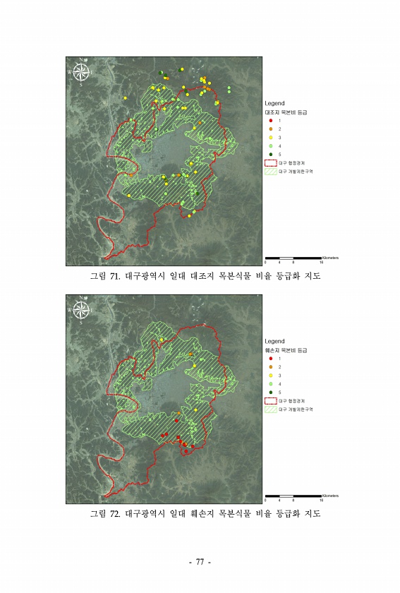 그림 71. 대구광역시 일대 대조지 목본식물 비율 등급화 지도 그림 72. 대구광역시 일대 훼손지 목본식물 비율 등급화 지도 77