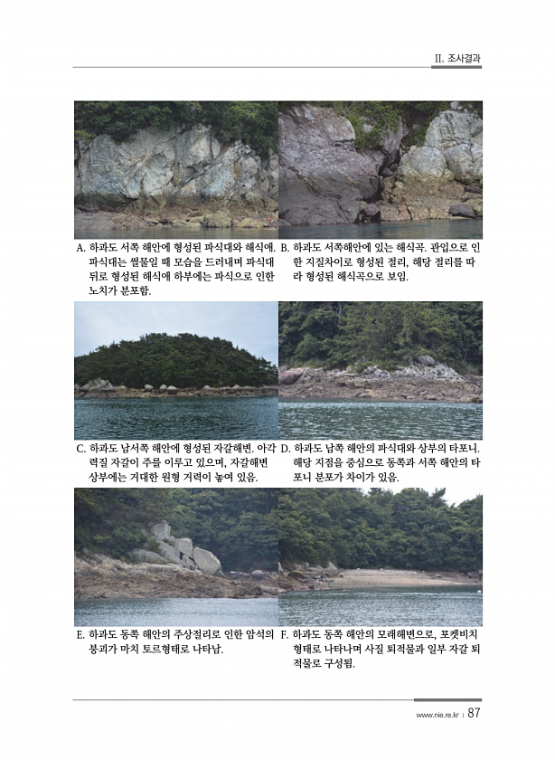 II. 조사결과 www.nie.re.kr ? 87 A. 하과도 서쪽 해안에 형성된 파식대와 해식애. 파식대는 썰물일 때 모습을 드러내며 파식대 뒤로 형성된 해식애 하부에는 파식으로 인한 노치가 분포함. B. 하과도 서쪽해안에 있는 해식곡. 관입으로 인 한 지질차이로 형성된 절리, 해당 절리를 따 라 형성된 해식곡으로 보임. C. 하과도 남서쪽 해안에 형성된 자갈해변. 아각 력질 자갈이 주를 이루고 있으며, 자갈해변 상부에는 거대한 원형 거력이 놓여 있음. D. 하과도 남쪽 해안의 파식대와 상부의 타포니. 해당 지점을 중심으로 동쪽과 서쪽 해안의 타 포니 분포가 차이가 있음. E. 하과도 동쪽 해안의 주상절리로 인한 암석의 붕괴가 마치 토르형태로 나타남. F. 하과도 동쪽 해안의 모래해변으로, 포켓비치 형태로...
