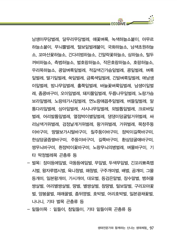 생태전문가와 함께하는 신나는 생태체험_ 97 남생이무당벌레, 달무리무당벌레, 애꽃벼룩, 녹색하늘소붙이, 아무르 하늘소붙이, 무늬뿔벌레, 털보잎벌레붙이, 국화하늘소, 남색초원하늘 소, 꼬마산꽃하늘소, 긴다리범하늘소, 긴알락꽃하늘소, 삼하늘소, 털두 꺼비하늘소, 측범하늘소, 벌호랑하늘소, 작은호랑하늘소, 호랑하늘소, 우리목하늘소, 콩알벼룩잎벌레, 적갈색긴가슴잎벌레, 콩잎벌레, 벼룩 잎벌레, 딸기잎벌레, 쑥잎벌레, 금록색잎벌레, 긴발벼룩잎벌레, 애남생 이잎벌레, 밤나무잎벌레, 홀쭉잎벌레, 바늘꽃벼룩잎벌레, 남생이잎벌 레, 좀콩바구미, 오이잎벌레, 돼지풀잎벌레, 두릅나무잎벌레, 노랑가슴 보라잎벌레, 노랑테가시잎벌레, 연노랑애꼽추잎벌레, 버들잎벌레, 알 통다리잎벌레, 상아잎벌레, 사시나무잎벌레, 외발톱잎벌레, 크로바...