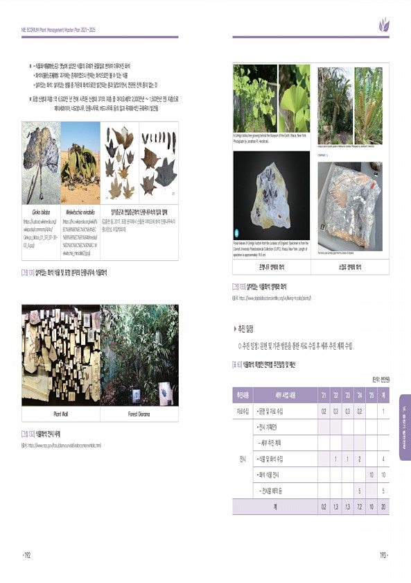 은행나무 생체와 화석 소철류 생체와 화석 [그림 133] 살아있는 식물화석 생체와 화석 출처https//www.digitalatlasofancientlife.org/ve/living-fossils/plants/ ▶ 추진 일정 ?? 추진 일정문헌 및 기관 방문을 통한 자료 수집 후 세부 추진 계획 수립 [표 63] 식물화석 특별전 연차별 추진일정 및 예산 단위천만원 추진내용 세부 사업 내용 ‘21 ‘22 ‘23 ‘24 ‘25 계 자료수집 ?문헌 및 자료 수집 0.2 0.3 0.3 0.2 1 전시 ?전시 기획 안 세부 추진 계획 ?식물 및 화석 수집 1 1 2 4 ?화석 식물 전시 10 10 전시물 제작 등 5 5 계 0.2 1.3 1.3 7.2 10 20 ※ ?식물화석 植物化石 옛날에 살았던 식물의 유해가 광...