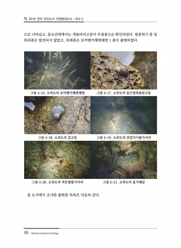 2018 전국 무인도서 자연환경조사 여수 3 88 ? National Institute of Ecology 으로 나타났고, 중조간대에서는 개울타리고둥이 우점종으로 확인되었다. 멸종위기 종 및 희귀종은 발견되지 않았고, 외래종은 보어밴키해변해면 1 종이 출현하였다. 그림 4-16. 소죽도의 보어밴키해변해면 그림 4-17. 소죽도의 둥근얼룩총알고둥 그림 4-18. 소죽도의 갈고둥 그림 4-19. 소죽도의 전갈가시불가사리 그림 4-20. 소죽도의 작은별불가사리 그림 4-21. 소죽도의 돌기해삼 본 도서에서 조사한 출현종 목록은 다음과같다.
