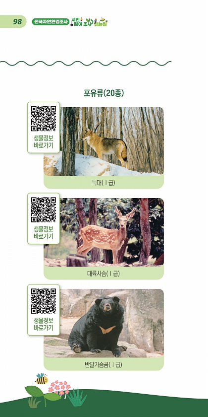 98 포유류 20종 늑대 Ⅰ급 대륙사슴 Ⅰ급 반달가슴곰 Ⅰ급 생물정보 바로가기 생물정보 바로가기 생물정보바로가기