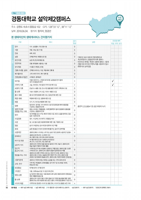 No. 속초- 본 생태자산의 생태계서비스 간이평가지 구분 예시 평가 등급 설명 규모별 혜택 지점 지역 국가 공급 담수 식수, 농업용수, 축산 용수 등 0 1982년 속초 최초의 전문대학으로 개교하였으나 2000년대 이후 캠퍼스 이전으로 현재는 학생수 0명의 캠퍼스 1동의 건물 이외 부지와 주변녹지를 사용하지 않고 유휴지로 남아있음 식량 곡물, 과실, 물고기 등 0 연료 화목, 토탄 0 섬유 건축용 목재, 의류용 섬유 등 0 유전자원 농업·축산업 희귀품종 등 0 천연약재 전통 의약품에 사용되는 식물 0 장식재료 수집용 조개껍질, 꽃 등 0 진흙,미네랄, 골재 건축용 모래 또는 자갈, 벽돌재료 진흙 등 0 폐기물처리 고체 쓰레기 하치, 폐수 방류 등 0 친환경에너지발전 조력발전, 풍력발전 0 조절 대기질 자동차...