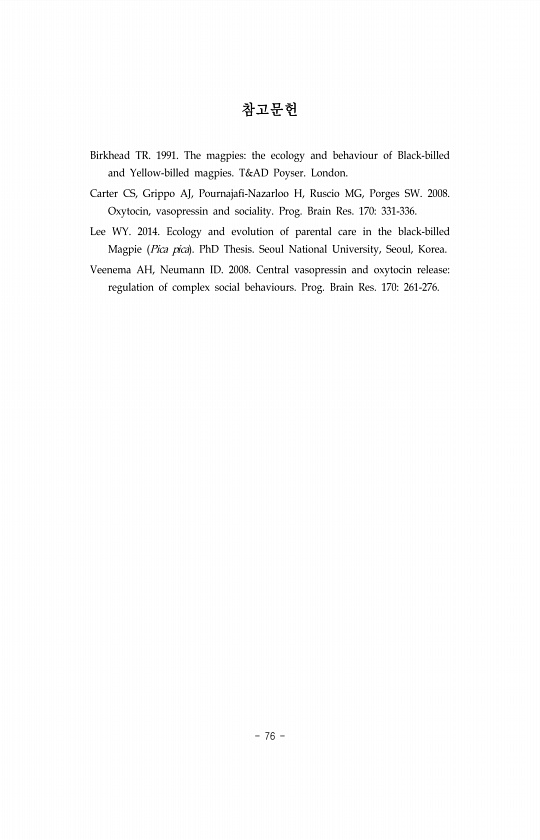 76 참고문헌 Birkhead TR. 1991. The magpiesthe ecology and behaviour of Black-billed and Yellow-billed magpies. T&AD Poyser. London. Carter CS, Grippo AJ, Pournajafi-Nazarloo H, Ruscio MG, Porges SW. 2008. Oxytocin, vasopressin and sociality. Prog. Brain Res. 170331-336. Lee WY. 2014. Ecology and evolution of parental care in the black-billed Magpie Pica pica PhD Thesis. Seoul National University, Seou...