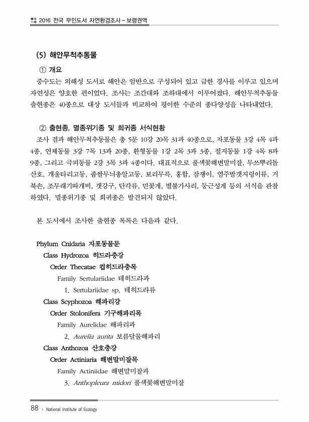 2016 전국 무인도서 자연환경조사 보령권역 88 ? National Institute of Ecology 5 해안무척추동물 ① 개요 중수도는 외해성 도서로 해안은 암반으로 구성되어 있고 급한 경사를 이루고 있으며 자연성은 양호한 편이었다. 조사는 조간대와 조하대에서 이루어졌다. 해안무척추동물 출현종은 40종으로 대상 도서들과 비교하여 평이한 수준의 종다양성을 나타내었다. ② 출현종, 멸종위기종 및 희귀종 서식현황 조사 결과 해안무척추동물은 총 5문 10강 20목 31과 40종으로, 자포동물 3강 4목 4과 4종, 연체동물 3강 7목 13과 20종, 환형동물 1강 2목 3과 3종, 절지동물 1강 4목 8과 9종, 그리고 극피동물 2강 3목 3과 4종이다. 대표적으로 풀색꽃해변말미잘, 무쓰뿌리돌 산호, 개울타...