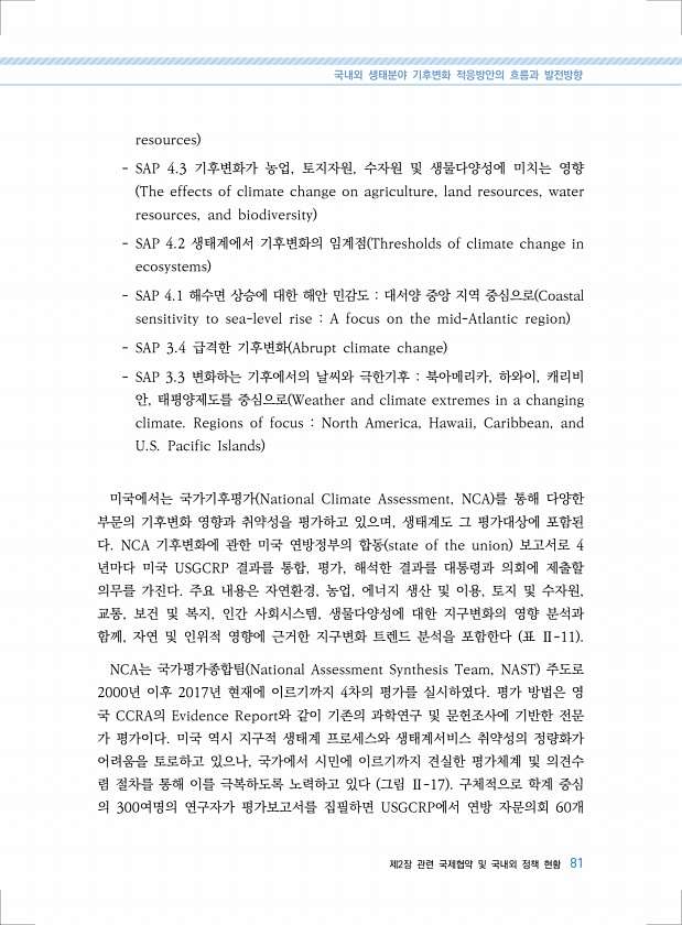 국내외 생태분야 기후변화 적응방안의 흐름과 발전방향 제2장 관련 국제협약 및 국내외 정책 현황 81 resources SAP 4.3 기후변화가 농업, 토지자원, 수자원 및 생물다양성에 미치는 영향 The effects of climate change on agriculture, land resources, water resources, and biodiversity SAP 4.2 생태계에서 기후변화의 임계점 Thresholds of climate change in ecosystems SAP 4.1 해수면 상승에 대한 해안 민감도 대서양 중앙 지역 중심으로 Coastal sensitivity to sea-level rise A focus on the mid-Atlantic region SAP 3.4 급격한 기...