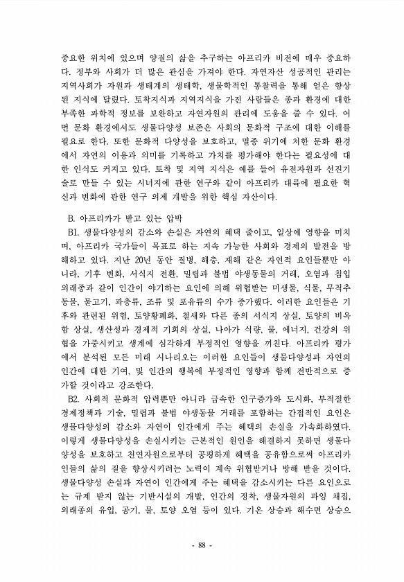 중요한 위치에 있으며 양질의 삶을 추구하는 아프리카 비전에 매우 중요하 다. 정부와 사회가 더 많은 관심을 가져야 한다. 자연자산 성공적인 관리는 지역사회가 자원과 생태계의 생태학, 생물학적인 통찰력을 통해 얻은 향상 된 지식에 달렸다. 토착지식과 지역지식을 가진 사람들은 종과 환경에 대한 부족한 과학적 정보를 보완하고 자연자원의 관리에 도움을 줄 수 있다. 어 떤 문화 환경에서도 생물다양성 보존은 사회의 문화적 구조에 대한 이해를 필요로 한다. 또한 문화적 다양성을 보호하고, 멸종 위기에 처한 문화 환경 에서 자연의 이용과 의미를 기록하고 가치를 평가해야 한다는 필요성에 대 한 인식도 커지고 있다. 토착 및 지역 지식은 예를 들어 유전자원과 선진기 술로 만들 수 있는 시너지에 관한 연구와 같이 아프리카 대...
