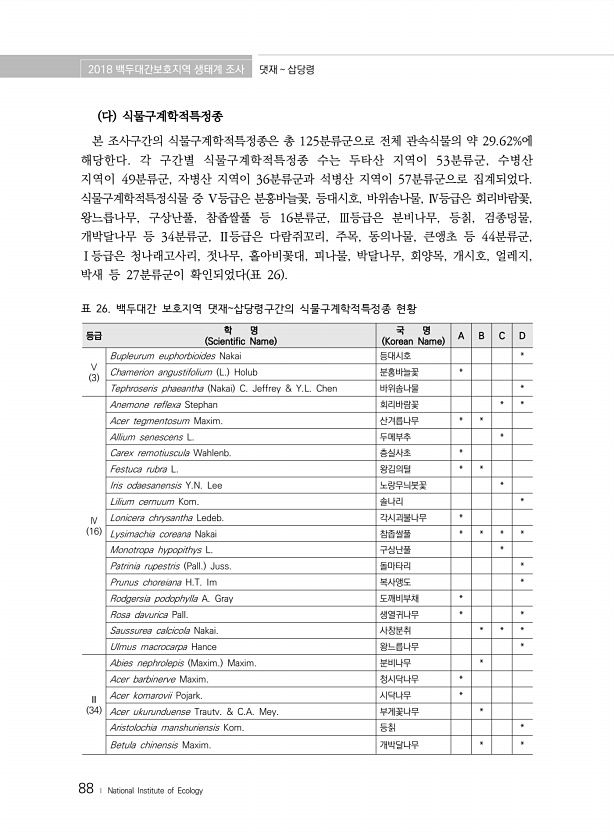 2018 백두대간보호지역 생태계 조사 댓재 삽당령 88 ? National Institute of Ecology 등급 학 명 Scientific Name 국 명 Korean Name A B C D Ⅴ 3 Bupleurum euphorbioides Nakai 등대시호 * Chamerion angustifolium L. Holub 분홍바늘꽃 * Tephroseris phaeantha Nakai C. Jeffrey & Y.L. Chen 바위솜나물 * Ⅳ 16 Anemone reflexa Stephan 회리바람꽃 * * Acer tegmentosum Maxim. 산겨릅나무 * * Allium senescens L. 두메부추 * Carex remotiuscula Wahlenb. 층실사초 * Festuca rubra ...