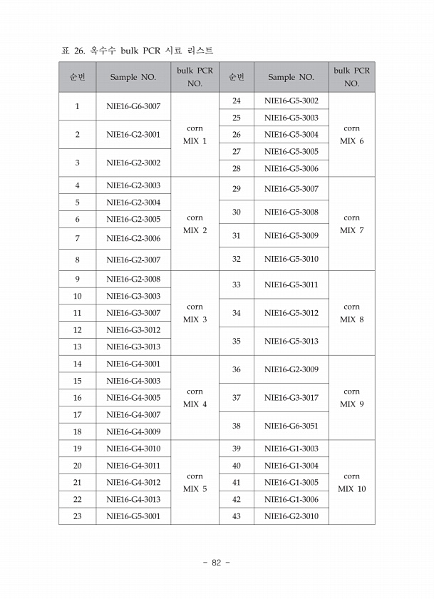 순번 Sample NO. bulk PCR NO. 순번 Sample NO. bulk PCR NO. 1 NIE16-G6-3007 corn MIX 1 24 NIE16-G5-3002 corn MIX 6 25 NIE16-G5-3003 2 NIE16-G2-3001 26 NIE16-G5-3004 27 NIE16-G5-3005 3 NIE16-G2-3002 28 NIE16-G5-3006 4 NIE16-G2-3003 corn MIX 2 29 NIE16-G5-3007 corn MIX 7 5 NIE16-G2-3004 30 NIE16-G5-3008 6 NIE16-G2-3005 7 NIE16-G2-3006 31 NIE16-G5-3009 8 NIE16-G2-3007 32 NIE16-G5-3010 9 NIE16-G2-3008 corn ...