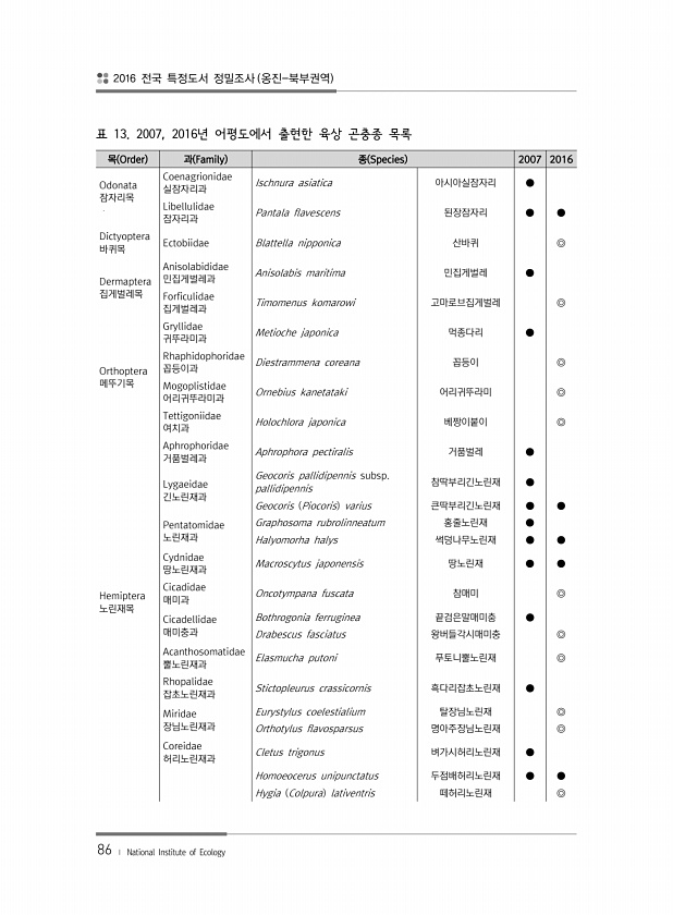 2016 전국 특정도서 정밀조사 옹진-북부권역 86 ? National Institute of Ecology 목 Order 과 Family 종 Species 2007 2016 Odonata 잠자리목 Coenagrionidae 실잠자리과 Ischnura asiatica 아시아실잠자리 ● Libellulidae 잠자리과 Pantala flavescens 된장잠자리 ● ● Dictyoptera 바퀴목 Ectobiidae Blattella nipponica 산바퀴 ◎ Dermaptera 집게벌레목 Anisolabididae 민집게벌레과 Anisolabis maritima 민집게벌레 ● Forficulidae 집게벌레과 Timomenus komarowi 고마로브집게벌레 ◎ Orthoptera 메뚜기목 Gryllida...
