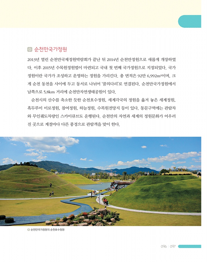 096 097 순천만국가정원 2013년 열린 순천만국제정원박람회가 끝난 뒤 2014년 순천만정원으로 새롭게 개장하였 다. 이후 2015년 수목원정원법이 마련되고 국내 첫 번째 국가정원으로 지정되었다. 국가 정원이란 국가가 조성하고 운영하는 정원을 가리킨다. 총 면적은 92만 6,992m2이며, 크 게 순천 동천을 사이에 두고 동서로 나뉘어 ‘꿈의다리’로 연결된다. 순천만국가정원에서 남쪽으로 5.8km 거리에 순천만자연생태공원이 있다. 순천시의 산수를 축소한 듯한 순천호수정원, 세계각국의 정원을 옮겨 놓은 세계정원, 흑두루미 미로정원, 참여정원, 하늘정원, 수목원전망지 등이 있다. 동문구역에는 관람차 와 무인궤도차량인 스카이큐브도 운행된다. 순천만의 자연과 세계의 정원문화가 어우러 진 곳으로 계절마다 다른 풍...