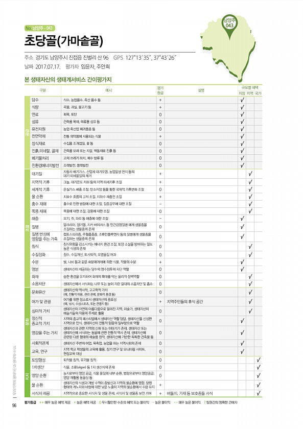 No. 남양주 남양주 043 본 생태자산의 생태계서비스 간이평가지 구분 예시 평가 등급 설명 규모별 혜택 지점 지역 국가 공급 담수 식수, 농업용수, 축산 용수 등 + √ 식량 곡물, 과실, 물고기 등 + √ 연료 화목, 토탄 0 √ 섬유 건축용 목재, 의류용 섬유 등 0 √ 유전자원 농업·축산업 희귀품종 등 0 √ 천연약재 전통 의약품에 사용되는 식물 + √ 장식재료 수집용 조개껍질, 꽃 등 0 √ 진흙,미네랄, 골재 건축용 모래 또는 자갈, 벽돌재료 진흙 등 0 √ 폐기물처리 고체 쓰레기 하치, 폐수 방류 등 0 √ 친환경에너지발전 조력발전, 풍력발전 0 √ 조절 대기질 자동차 배기가스, 산업체 대기오염, 농업발생 먼지 등의 대기 미세물질의 제거 + √ 지역적 기후 그늘, 대기온도 저하 등의 지역 미세기...