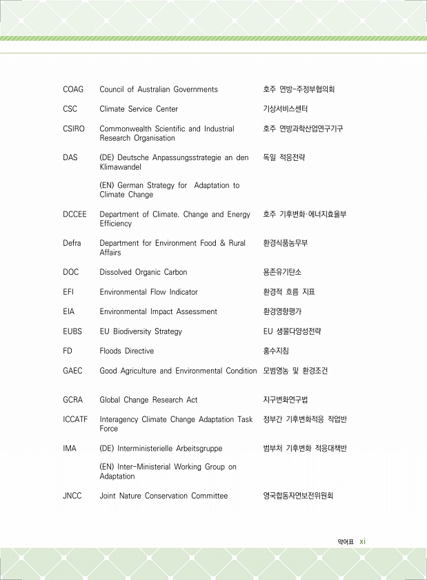 약어표 xi COAG Council of Australian Governments 호주 연방-주정부협의회 CSC Climate Service Center 기상서비스센터 CSIRO Commonwealth Scientific and Industrial Research Organisation 호주 연방과학산업연구기구 DAS DE Deutsche Anpassungsstrategie an den Klimawandel EN German Strategy for Adaptation to Climate Change 독일 적응전략 DCCEE Department of Climate. Change and Energy Efficiency 호주 기후변화·에너지효율부 Defra Department for Environment Food...