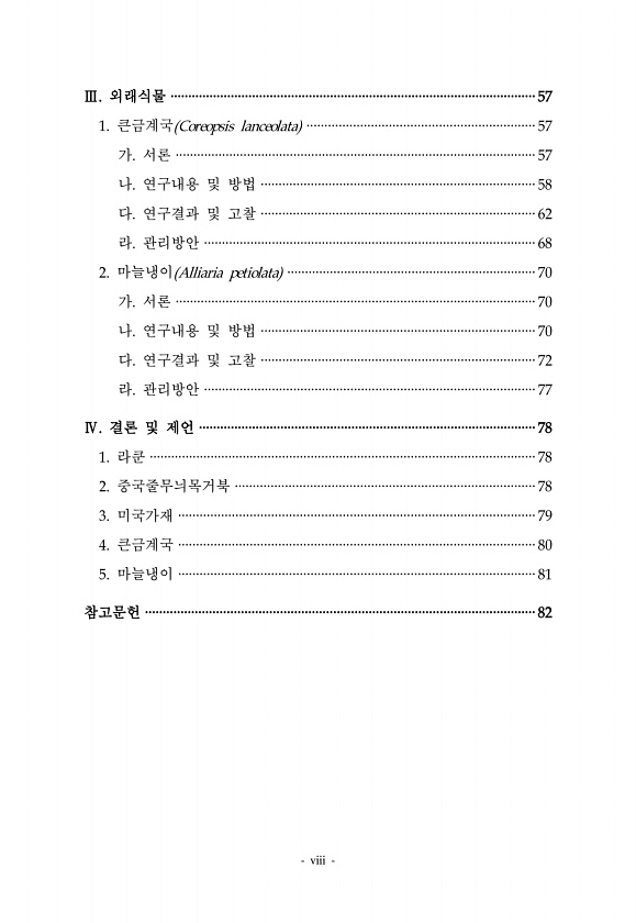 viii Ⅲ. 외래식물 ·······································································································57 1. 큰금계국 Coreopsis lanceolata ································································57 가. 서론 ·····································································································57 나. 연구내용 및 방법 ······························································...
